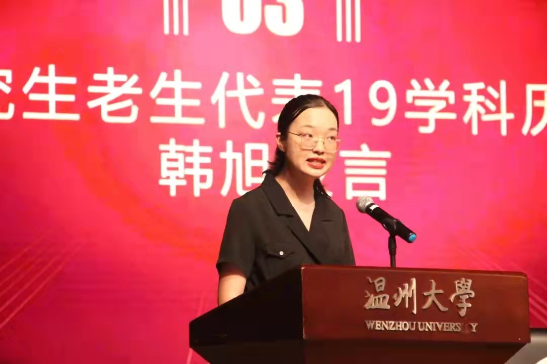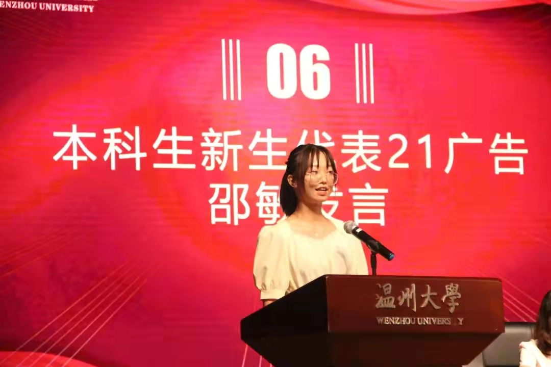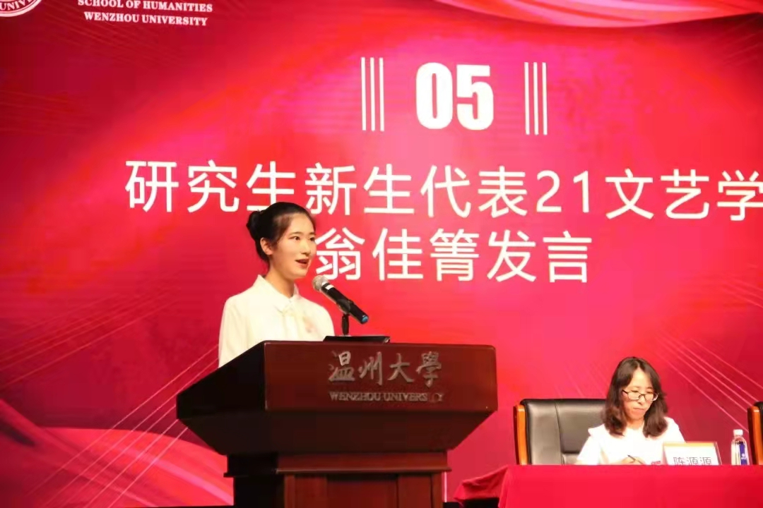 来自19级学科历史的韩旭同学和19级中本1班的叶子涵同学分别作为在校研究生、本科生代表依次上台发言,展现了他们对学术的热情与知识追求的过往。韩旭分享了自己的学习感悟,他认为要以兴趣为信仰,建议新生在学习内容专业化、时间个人化、选择方向自由化的情况下,确定自己的人生目标,规范自己;叶子涵认为学术固然重要,但也需要实践。只有通过不同的比赛和实践,才能发掘自己的潜能,充实自己的生活。随后,来自21级文艺学翁佳箐同学和21级广告邵敏同学分别作为研究生、本科生新生代表依次上台发言,他们将自己的分享娓娓道来,认为大学是积累的过程,提醒大家在追求真理的道路上,都要以崭新的面貌去奋斗。 “我们要为新生活展开美好的想象,与奋斗相拥,与平庸相逝。要在心中燃烧一把火,在心中留一盏灯,在大学期间沉淀自己。”