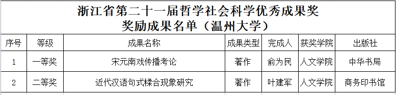 近日,浙江省第二十一届哲学社会科学优秀成果奖名单正式公布,我院共两项科研成果获第二十一届浙江省哲学社会科学优秀成果奖,其中俞为民教授的科研成果获一等奖,叶建军教授的成果获二等奖,获奖总数在财神捕鱼 所有院系中独占鳌头。具体获奖情况如下: