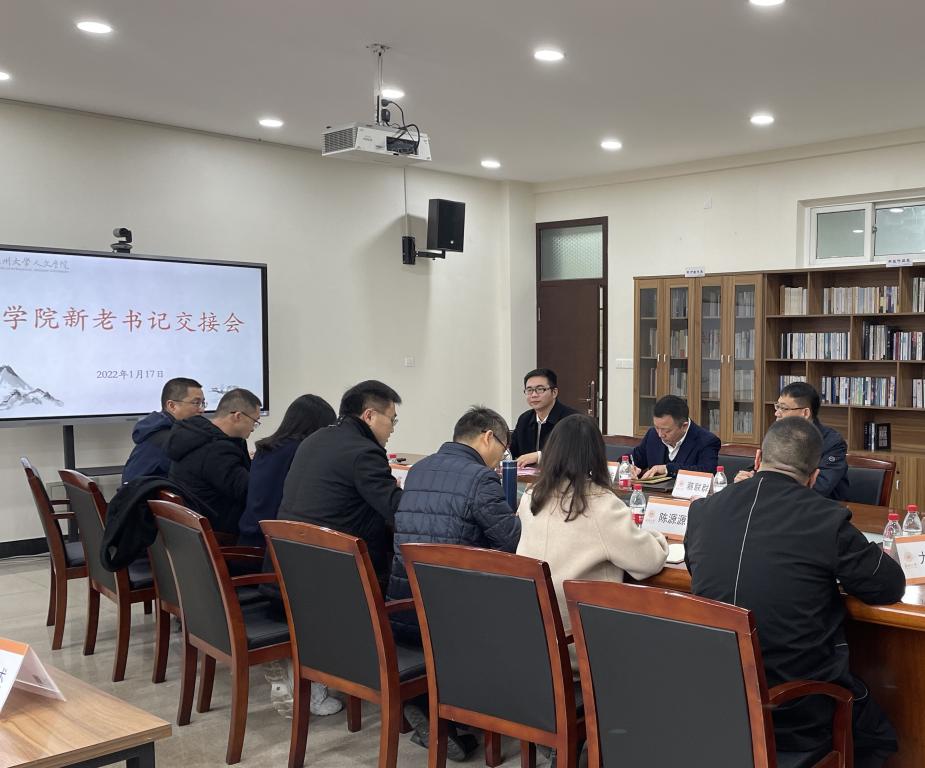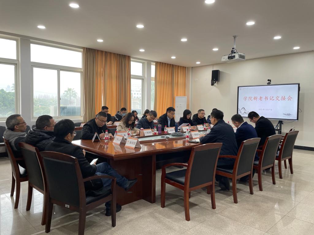 2022年1月17日,财神捕鱼 在人文楼213会议室举行财神捕鱼 新老书记交接会,会议由孙良好院长主持,校党委书记谢树华、党校办主任蔡联群、财神捕鱼 新书记江秀景、财神捕鱼 班子成员、各支部书记、各科室负责人、院工会主席参加会议。