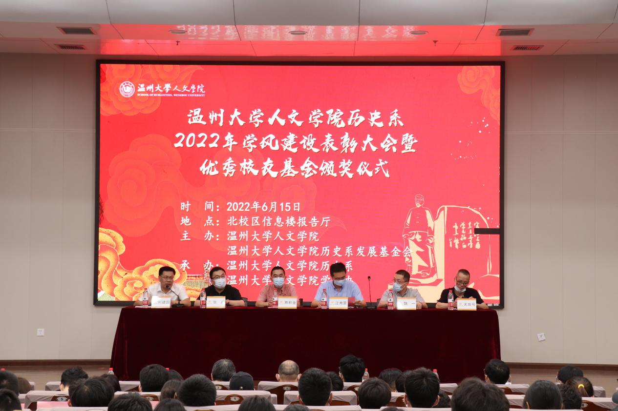 2022年6月15日,财神捕鱼 历史系2022年学风建设表彰大会暨优秀校友基金颁奖仪式于北校区信息楼报告厅举行。大会由财神捕鱼 历史系发展基金会会长刘建国主持,院党委书记江秀景、副书记魏一、张真老师、历史系主任尤育号、93政史校友陈积金以及历史系全体师生出席了此次会议。