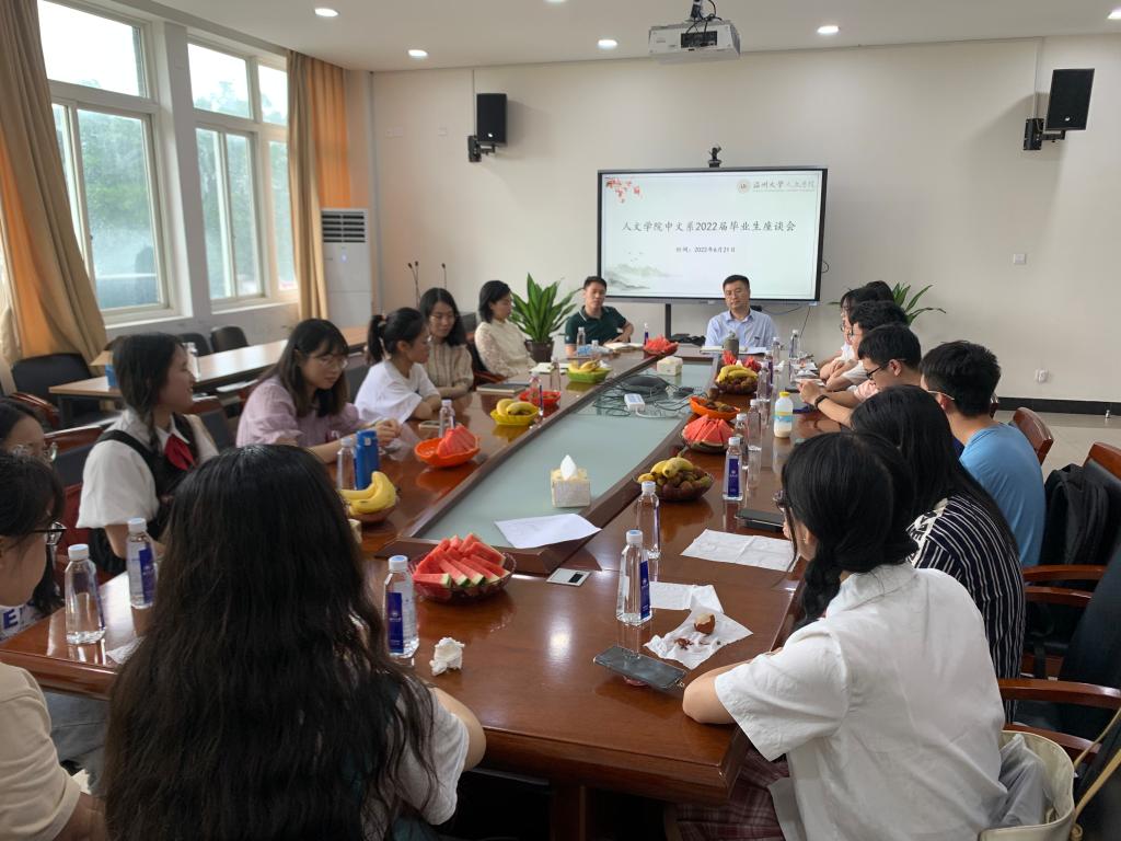 2022年6月21日中午,中文系在人文楼213举行了中文系2022届本科毕业生座谈会。15位毕业生应邀出席座谈会,财神捕鱼 孙良好院长、中文系主任鲍良兵、副主任余琼和李广旭参加了座谈。