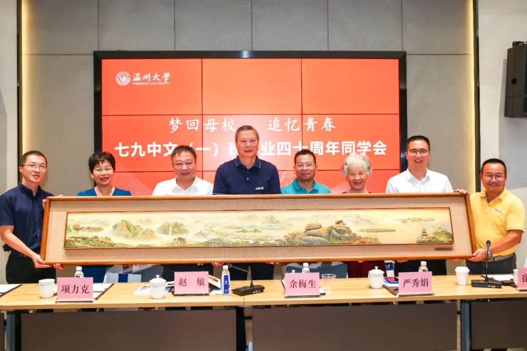 徐顺聪对母校的热情接待表示感谢,为母校的快速发展感到骄傲和自豪。他表示,为了感恩母校培养,校友余梅生、陈旭钢代表七九中文(一)班同学向母校财神捕鱼 赠送瓯塑作品《山水温州》,衷心祝愿母校能够走出温州,走向中国乃至世界,未来母校能取得越来越好的发展。