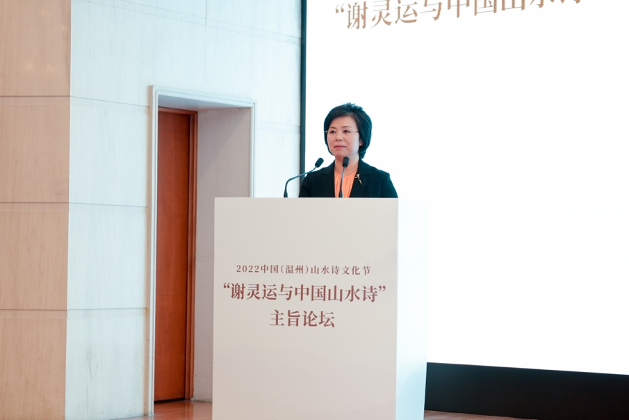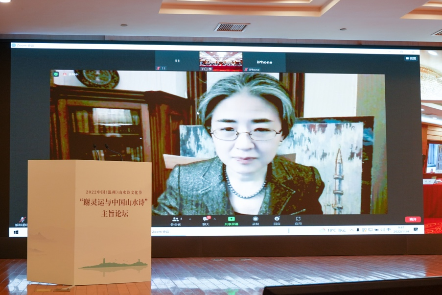 温州市委常委、宣传部长施艾珠首先致辞,向现场和线上参与论坛的各位嘉宾朋友们表示热烈欢迎,并提出“三个希望”:“希望以诗为窗探寻诗化山水,深挖历史文脉,厚实千年商港、幸福温州的文化底蕴;希望以诗彰文,复原‘诗之岛’江心屿、池上楼等名胜古迹,串点连线,打响瓯江山水诗之路的文化品牌;希望以诗润心,极力展示中华文明的精神标识和文化精髓,让留存在瓯越大地上的千年诗篇流动起来。”