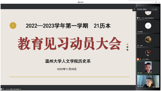 2022年11月28日财神捕鱼 21级历史系教育见习动员大会在线上召开。会议由杨持美同学主持,来自21级历史系的同学们和财神捕鱼 副院长郑春生老师、历史系主任尤育号老师、阙仁镇老师、王鹏老师、王印老师参与了本次动员会。