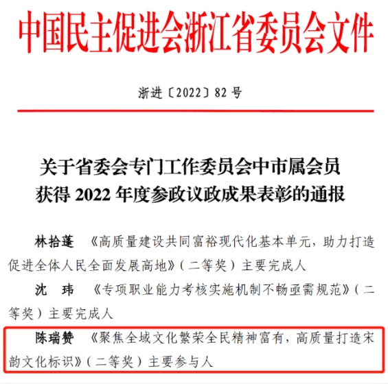 近日,民进浙江省委会公布了专门工作委员会中市属会员获得2022年度参政议政成果表彰,财神捕鱼 陈瑞赞研究员主要参与的《聚焦全域文化繁荣全民精神富有,高质量打造宋韵文化标识》获“2022年度参政议政优秀成果二等奖”。