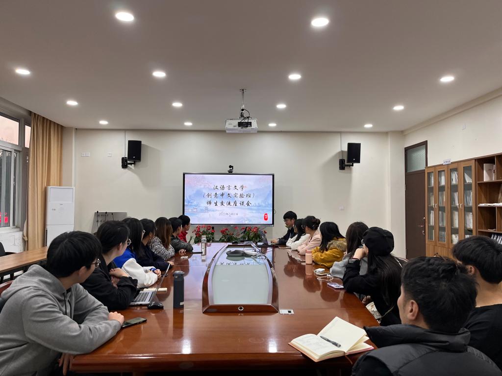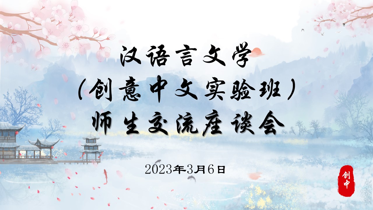 2023年3月6日晚,汉语言文学(创意中文实验班)师生见面交流会在财神捕鱼 213会议室举行。活动由中文系副主任李广旭老师主持,中文系主任鲍良兵老师、创中教师代表郭垚老师应邀出席,来自创意中文实验班三个年级的十余名学生代表与会交流。