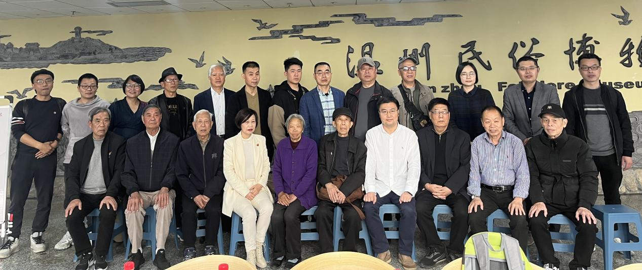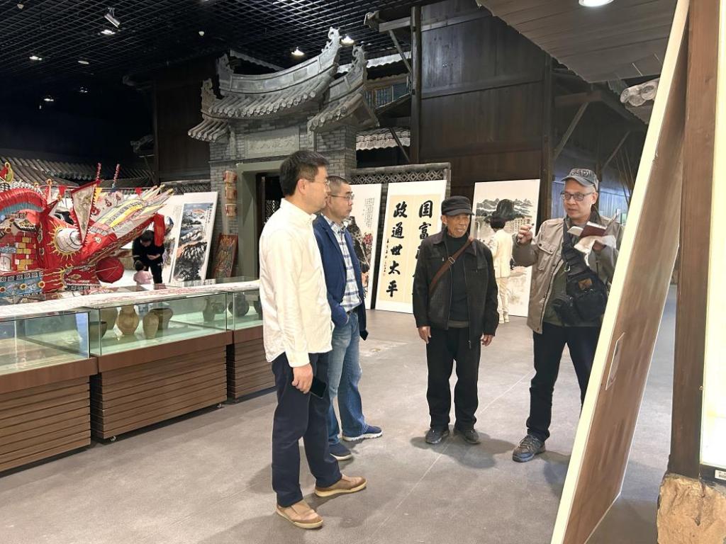 (泉川艺社社长、茶山街道新乡贤联谊会秘书长王大普、 “农民书画家”王学钊与财神捕鱼 温州民俗博物馆万军合影)
