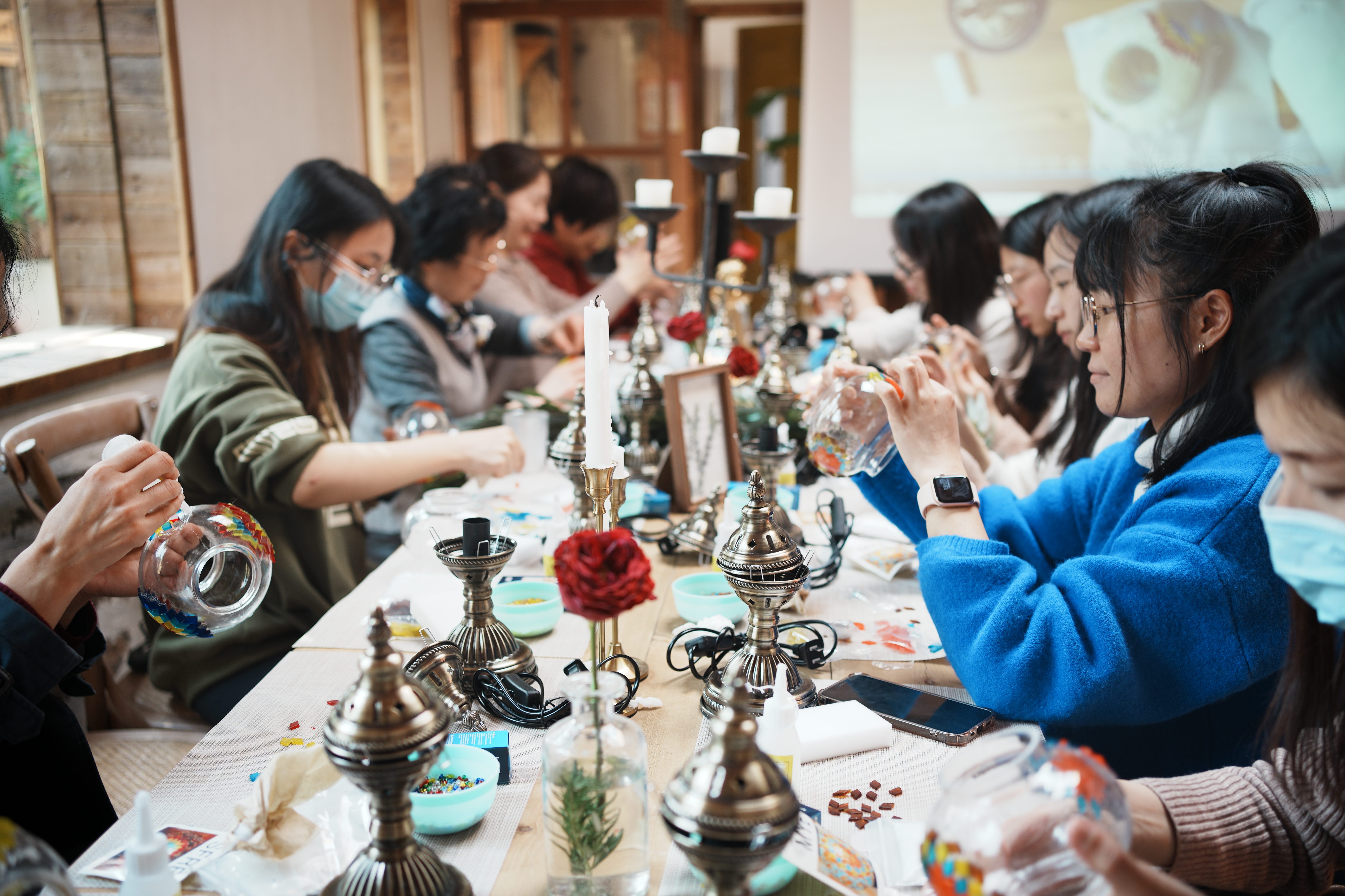 在这个美丽的季节里,女教师们沐浴着春日温暖的阳光,一边倾心品茗,一边精心手作。一颗颗晶莹剔透的马赛克珠子经过老师们的巧手,化为灯罩上的点点星光,投射出阳光律动的影子。土耳其马赛克手工灯的制作,既为老师们带来手力与心力的双重挑战,又时时诉说着来自节日的美好期待。亮灯的刹那,喜悦纷至沓来,惊喜无处不在。