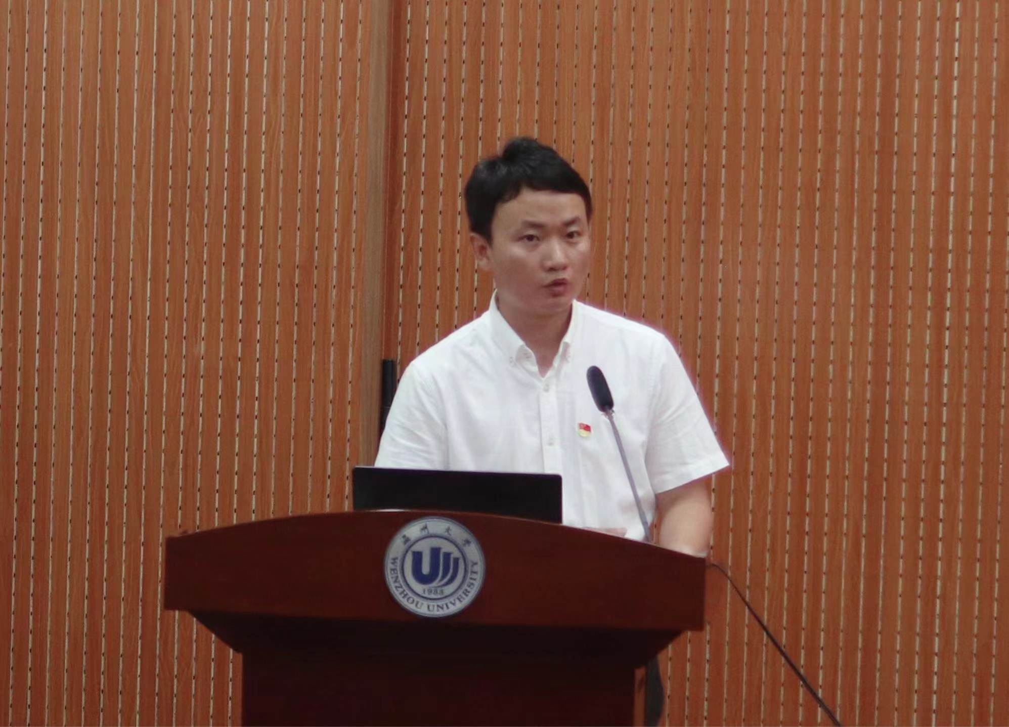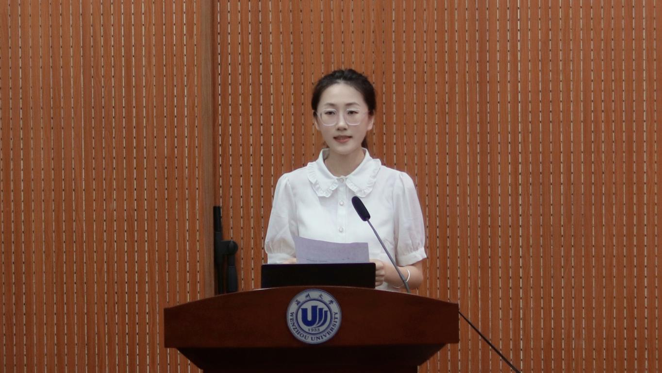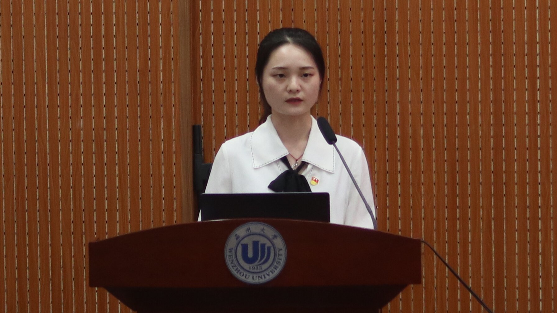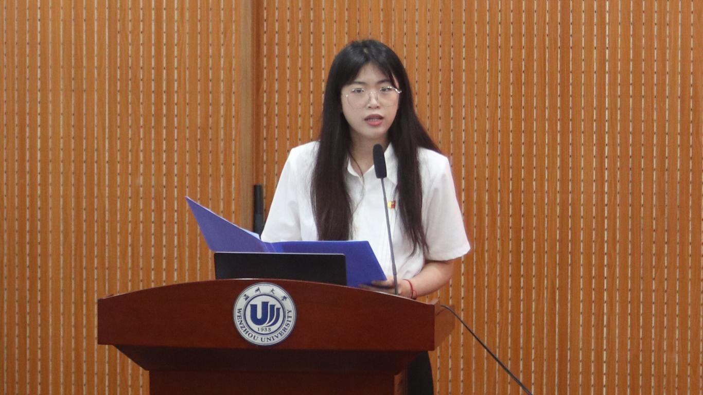 接下来由三位学生代表依次发言。首先,21学科教学(语文)专业的研究生章溢琦作为优秀党员代表发言,作为青年党员,要强理论、筑信念;争创新、勇追梦;践初心、担责任;当先锋、争先行;学用结合、勇于担当,努力为财神捕鱼 的党建工作做出贡献。