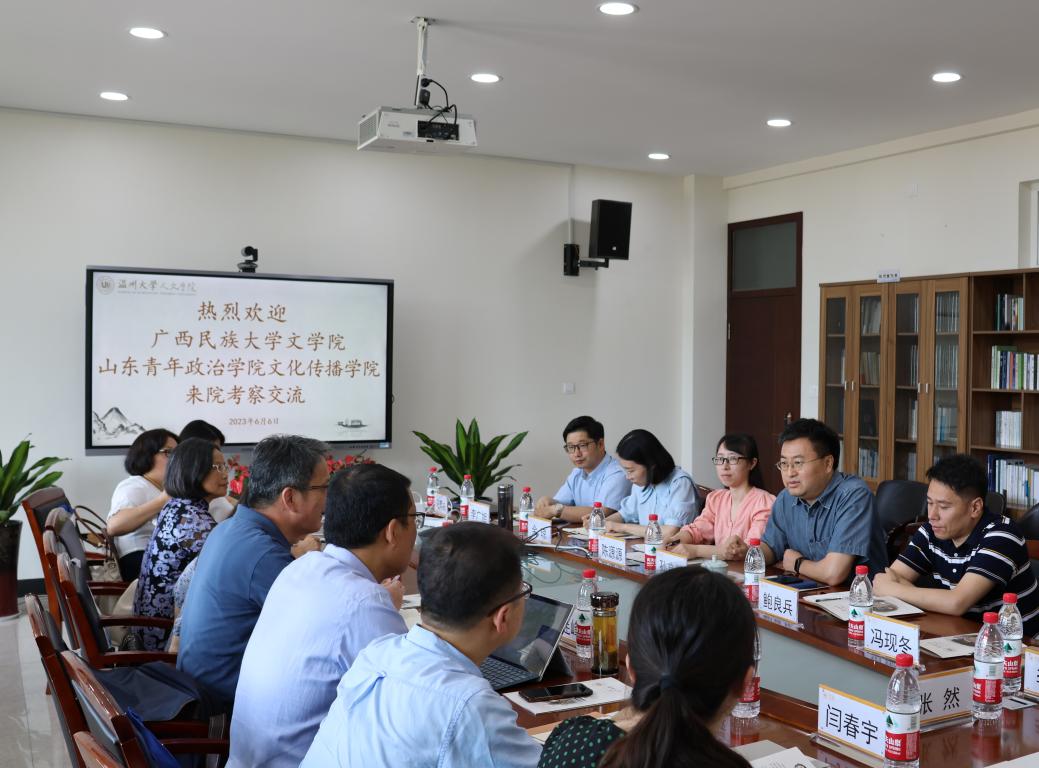 6月6日上午,广西民族大学文财神捕鱼 叶君院长和山东青年政治财神捕鱼 文化传播财神捕鱼 王连峰书记一行人来财神捕鱼 交流访问。财神捕鱼 孙良好院长、陈源源副院长、中文系主任鲍良兵、中文系副主任余琼、中文系副主任李广旭和办公室主任马声威予以了热情接待。座谈会主要围绕财神捕鱼 在学科科研建设、人才培养和汉语言文学(创意中文实验班)专业建设等方面展开交流学习。
