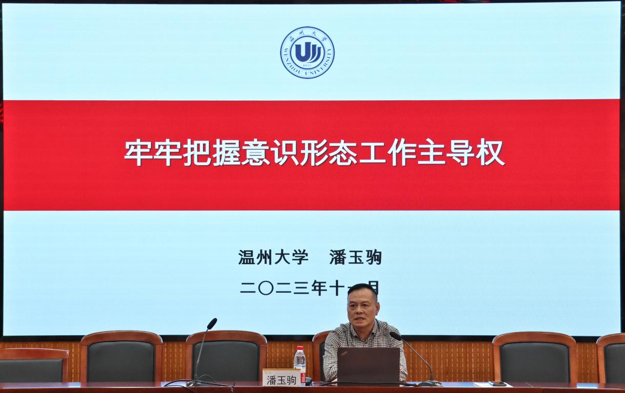 潘玉驹副校长围绕“牢牢把握意识形态工作主导权”这一主题,从“什么是意识形态工作”“为什么要加强意识形态工作”“如何把握意识形态工作主导权”3个方面展开深入分析。他指出,意识形态工作是党的一项极端重要的工作,中国共产党自诞生以来就始终高度重视意识形态建设。加强意识形态工作是现实所需、目标所致,对破除历史虚无主义、引导网络舆论、维护正确价值观有着重要作用。要把握意识形态工作主导权就要进一步强化理论武装,拉长思想高线;就要注重文化建设,对牢文化中线;就要压实主体责任,守住安全底线。希望全体教职员工自觉以新时代好教师的标准严格要求自己,坚持师德第一标准、严守意识形态阵地,坚守意识形态工作底线,以德育人、以文化人,为党的教育事业贡献力量。