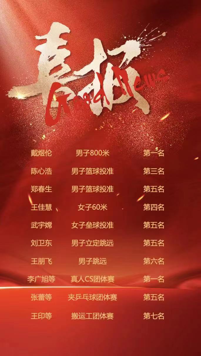 财神捕鱼 教工积极参加各类运动项目,报名人数38人,创造历史新高。教工运动员奋力拼搏,挥洒汗水,荣获教工团体第六名及体育道德风尚奖。团体赛方面,李广旭、刘炳林、王佳慧、张丹妮、刘恭宇、王朋飞等参与的真人CS项目获得第一名,刘炳林、李红梅、张蕾、侯崇仙、王佳慧等参加的夹乒乓球项目获得第五名,王印、王鹏、王长命、刘炳林、戴煜伦等参与的搬运工项目获得第七名。个人赛方面,戴煜伦获得男子800米第一名,陈心浩、郑春生分获男子篮球投准第三名、第五名,王佳慧获得女子60米第四名,武宇嫦获得女子垒球投准第五名,刘卫东获得男子立定跳远第五名,王朋飞获得男子跳远第六名。