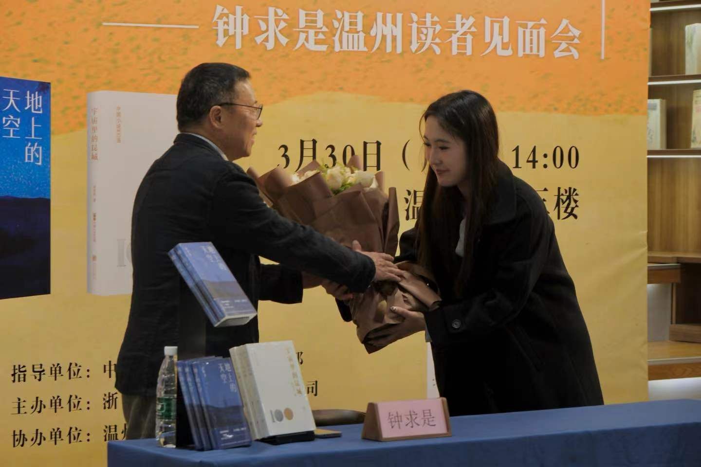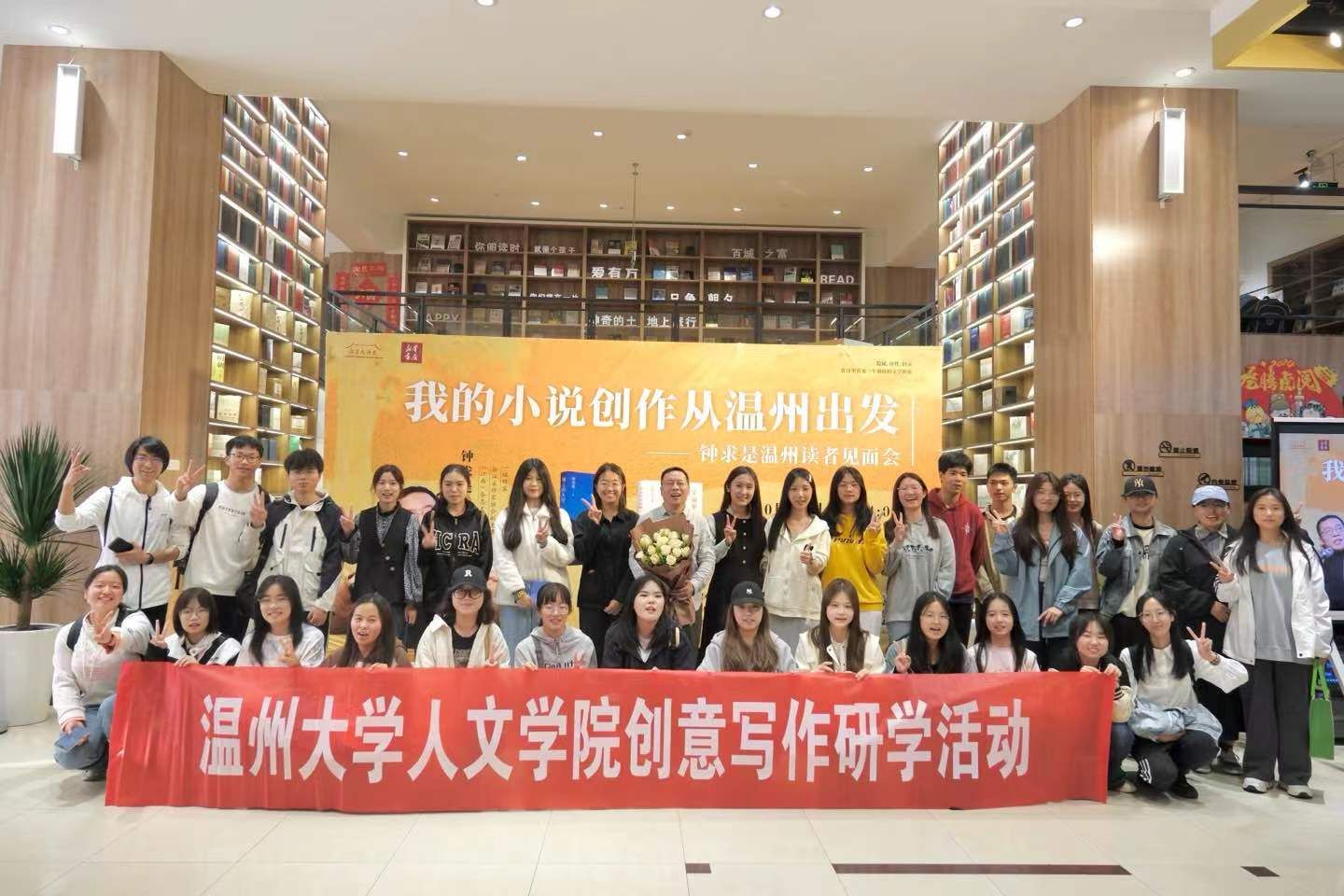 2023年3月30日,23级汉语言文学(创意中文实验班)学生在刘卫东老师的带领下赴温州书城开展研学活动,参加了温州书城20周年店庆首场名家分享活动。本次活动有幸请到国内著名温籍作家、《江南》杂志主编、作品获鲁迅文学奖、《小说月报》百花奖、十月文学奖、浙江省作家协会副主席钟求是先生,他为大家作主题为“我的小说创作从温州出发”的讲座。本次活动在中共温州市鹿城区委宣传部的指导下,由浙江温州市新华书店有限公司主办,财神捕鱼 协办。