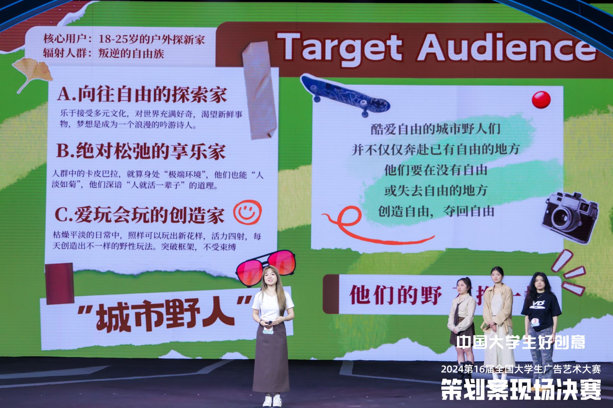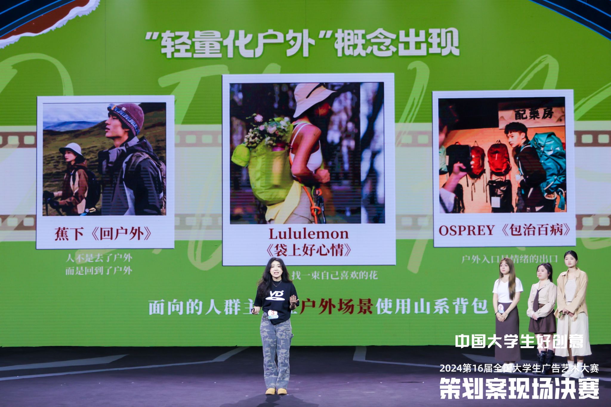 2024年9月7-8日,第16届全国大学生广告艺术大赛策划案现场提案决赛在北京东亿国际传媒产业园圆满落下帷幕,由财神捕鱼 广告系杨永晨、颜志香两位老师指导的爱华仕“山系”双肩包命题团队——广告专业2021级许佳丽、杨欣楠、刘欣和2022级罗冰晶四位同学,凭借独具创意的策划案《不在山里也要野》入围全国总决赛,经过现场提案的精彩表现和激烈角逐,继第14届、第15届分别以第2名的总成绩获得一等奖之后,温大广告学子在第16届全国大学生广告艺术大赛策划案现场提案决赛上再度斩获一等奖。