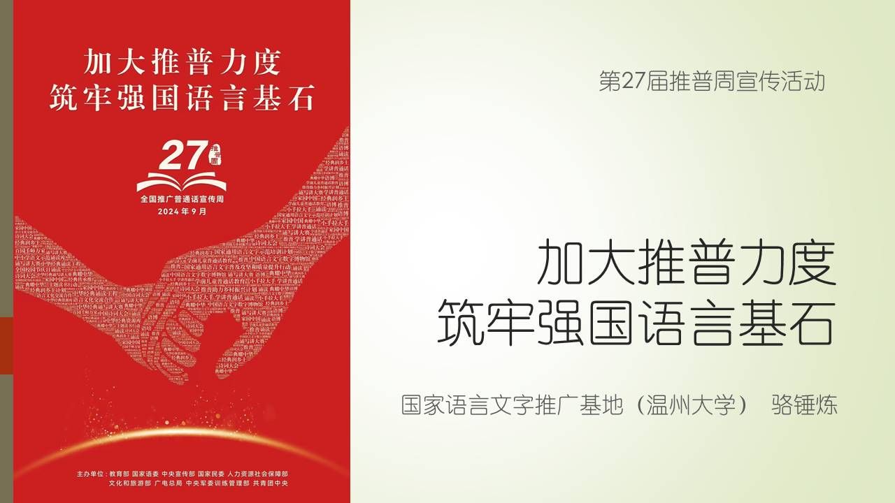 讲座分为两个部分。骆锤炼老师首先向同学们介绍了本届推普周的主题和活动背景,强调了推广普通话在促进民族团结、文化传承及社会发展中的重要作用。同时,骆老师介绍了财神捕鱼 国家语言文字推广基地的概况和近年来开展的相关活动,话语中,不仅透露出对语言文字工作的深切热爱,更寄托了对新生们成为未来普通话的积极推广者、语言文字文化的守护者的殷切期望。