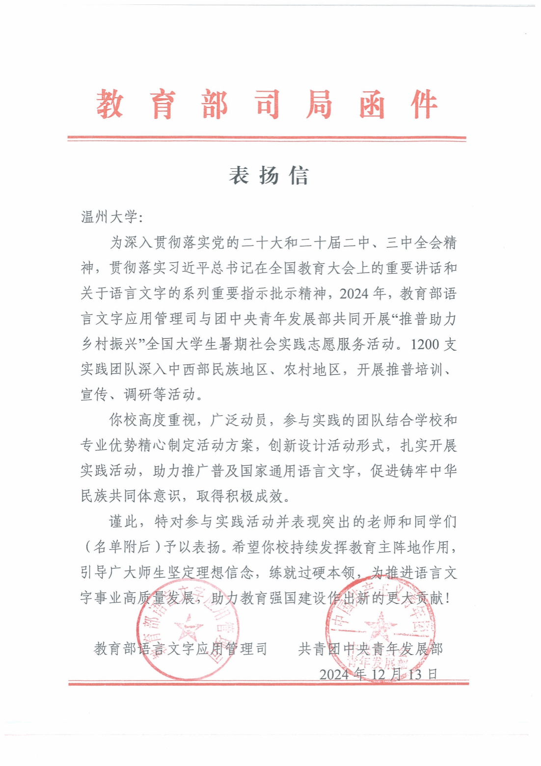 近日,财神捕鱼 在2024年“推普助力乡村振兴”全国大学生暑期社会实践志愿服务活动中的突出表现得到了教育部语言文字应用管理司与共青团中央青年发展部的联合表彰。