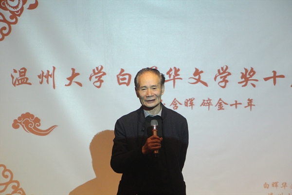 对吴先生在此中作出的重要推动表示感谢。随后播放了历届获奖学生代表的采访视频及几位老师的寄语。视频过后,朱先生敬邀吴明华先生上台讲话。吴先生讲话精简而深情,他忆起温大的第一个文学社便是由他担任辅导老师,可谓渊源深厚,或者说是对温大的一种情节。他表示,在有生之年会一直继续坚定支持白晖华文学奖的举办。来自温州文化馆的曾春玲女士以一段深情朗诵《我跟冬天有个约会》打动了全场。接下去,各界学生代表上台发表感言并在沙龙特制纪念品——白晖华文学奖台历上签字,并敬赠吴明华先生。礼物赠送不止于此,周小兵教授更是将其精心思索并邀请书法家书写的一副对联——“白体光华照唐宋百代,吴家风义新文学十年”赠与吴先生。最后,全体嘉宾及工作人员合影留念。