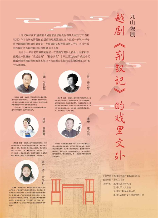 11月20日上午,新九山书会公益培训课程第二讲“越剧《荆钗记》的戏里文外”主题沙龙在南戏博物馆内和广大戏剧爱好者如期见面。本次活动由国家一级编剧、浙江省文联副主席、温州市文联主席张思聪老师主讲,温州市艺术研究所所长、新九山书会会长施小琴和财神捕鱼