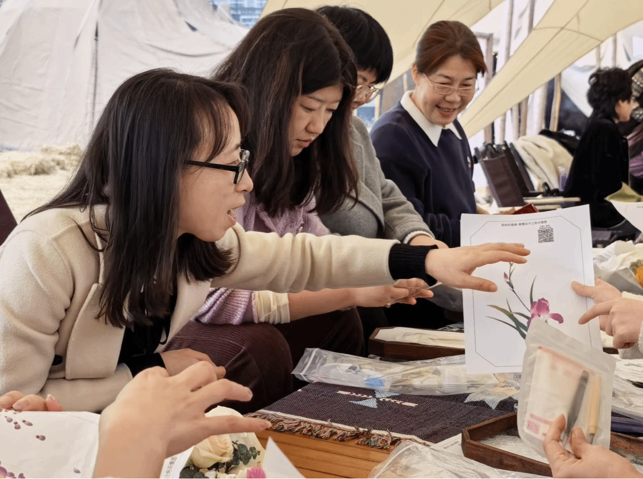 活动当天,阳光明媚,青灯市集内人声鼎沸,洋溢着浓厚的节日氛围。中午时分,女教职工们陆续抵达活动现场,大家享受着丰盛的美食,分享着工作与生活中的点滴趣事,欢声笑语不断,氛围温馨而融洽。午餐过后,活动进入了高潮部分——掐丝珐琅画餐盘制作。在专业老师的指导下,女教职工们纷纷拿起工具,在餐盘上勾勒线条,展现了女性们的艺术才华,体现了大家对美好生活的热爱与追求。