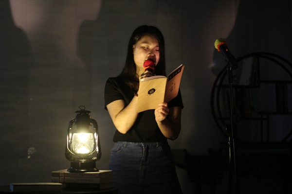 首先是由同学们为大家带来的诗歌朗诵,古今中外,精彩纷呈,有来自顾城的《不是再见》、北岛的《回答》、余光中的《乡愁四韵》,也有来自茨维塔耶娃的《我想和你一起生活》、《我的日子》,甚至还有同学们自己写的小诗,如12中本吴云望同学的《致末日》,她说:“我姑且将它称为是一首诗,其实更多的,是我对大学生活的回顾和怀念”;接着崔勇老师也为我们带来了来自穆旦的《冥想》,其中的一句:“我的全部努力/不过完成了普通的生活”作为本次诗会的引子,格外让人浮想联翩。史无前例的诗剧《女神之再生》在同学们的精彩演绎下更是赢得了阵阵掌声。最后是自由朗诵,在这个夜晚,只要你有一份诗情,就可以上台展现。如此浪漫而充满诗意的氛围,使在场所有的同学们跃跃欲试,争相上台吟诵自己心爱的小诗,吟诵自己心中的诗意。