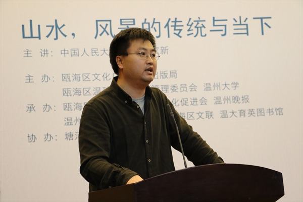 “山水是养育我们中国人性灵和心灵的怀抱,是我们诗歌和美学传统中最值得我们骄傲的精华的部分。”王家新老师在讲座中介绍了谢灵运山水诗典丽清新的特点以及其对中国山水诗传统变革的卓越贡献。“人类的自我中心主义仍是很难摆脱,山水成为一个诗意化的装置,山水和自然很难获得独立的意义。”谢灵运敏锐的感官能力,出色的语言表达刻画出了永嘉山水的清秀明丽,使山水成为诗歌的主体对象。诗的生命在于真实,真实是心灵的艺术担保。在人被连根拔起的时代,何为诗意的栖居?王家新老师联系自己在武当山下的生活,指出在宗教的角度上说,山水就是我们的教堂,山水的怀抱就是童年的怀抱,就是历史的怀抱,就是神的怀抱。期间,王老师朗诵了几首自己创作的诗歌,包含着对山水的深情与热爱。“中国的传统必然存在在我们的血液之中,触及基因,是我们生命的潜文本。”他也痛心地指出现在的山水诗中的山水都是“被过滤掉”的山水,诗意化的想象,我们在唯美的山水诗中长大,把丑陋的懒蛤蟆排除在诗歌之外。他呼吁我们在传统当中发现新的审美意味,摆脱自身的贫乏和视野的局限性,用新的方式来激活传统,激活发现山水真实之美的眼睛。