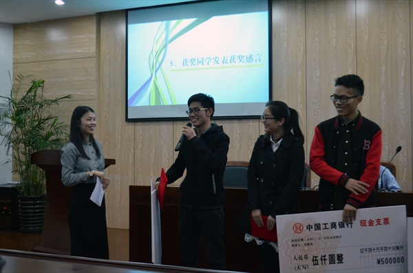 最后,好望角公司季晓飞总经理宣布了获奖名单,共有6名同学获得了5000元奖金,他们分别是李益碧、李雅婷、汪新东、赵莎莎、顾晨娴、陈强。拿着大张的支票,获奖者们都难以掩饰喜悦和感激之情,对广告学专业的老师、同学,对财神捕鱼