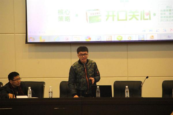 的作品——999感冒灵品牌营销策划案《开口关心》,由何林青同学代表队员展示。他们将999品牌竞争力概括为温暖和关怀的形象,将产品的开口与人的开口结合,鼓励消费者从尝试到习惯开口关心他人,强调独立第一步从分享爱开始,整个策划案充满了人文关怀。同时,活用视频和广告歌,也与煽情的基调相得益彰。