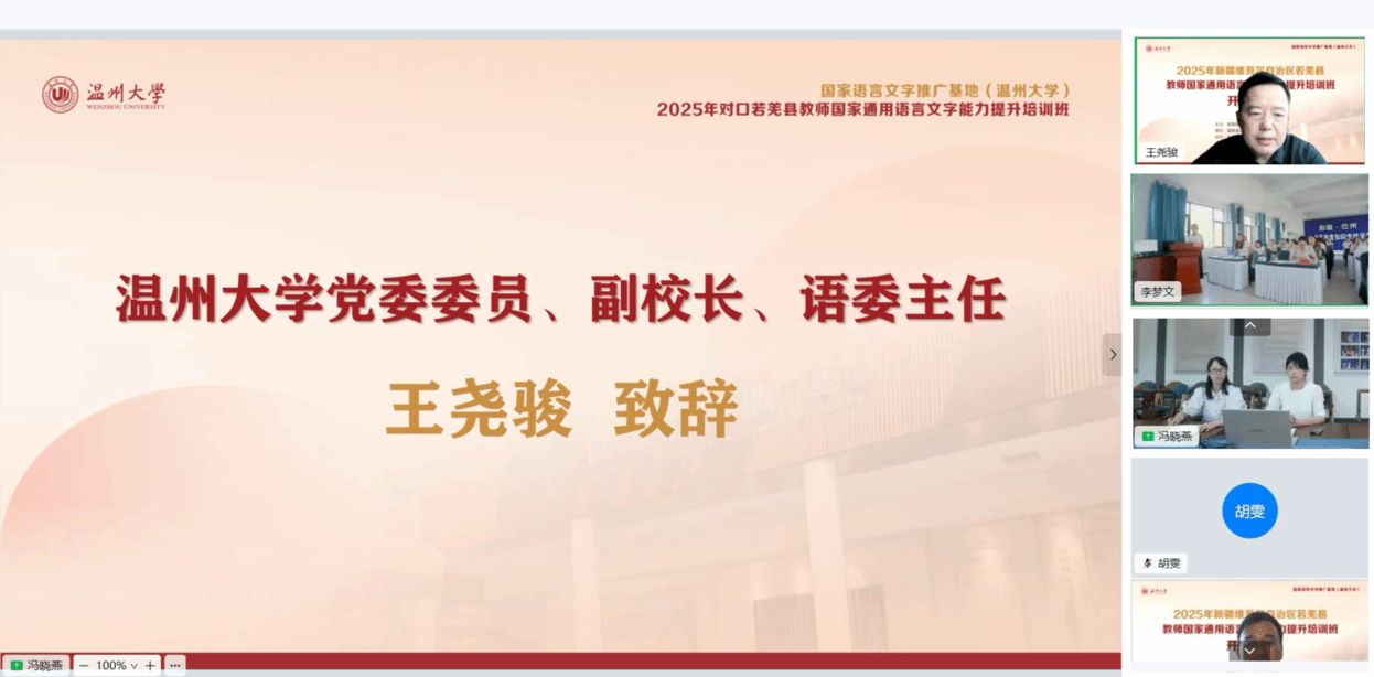 为深入贯彻落实《教育强国建设规划纲要(2024—2035年)》,加大国家通用语言文字推广力度,铸牢中华民族共同体意识,8月12日,由教育部语言文字应用管理司主办、国家语言文字推广基地(财神捕鱼 )承办、新疆若羌县教科局协办的2025年对口若羌县教师国家通用语言文字能力提升培训班举行开班仪式。