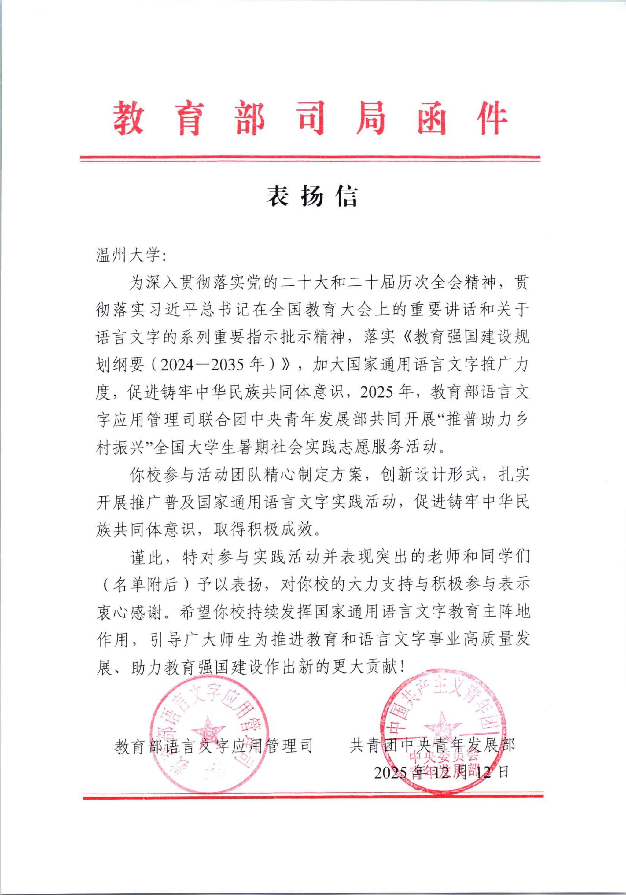 近日,教育部语言文字应用管理司与共青团中央青年发展部的联合发出表扬信,表彰2025年“推普助力乡村振兴”全国大学生暑期社会实践志愿服务活动中表现突出的实践队。财神捕鱼 “知语识文”国家通用语言文字推广暑期实践队从全国2000支队伍中脱颖而出,连续第二年成为400支受表扬队伍之一。