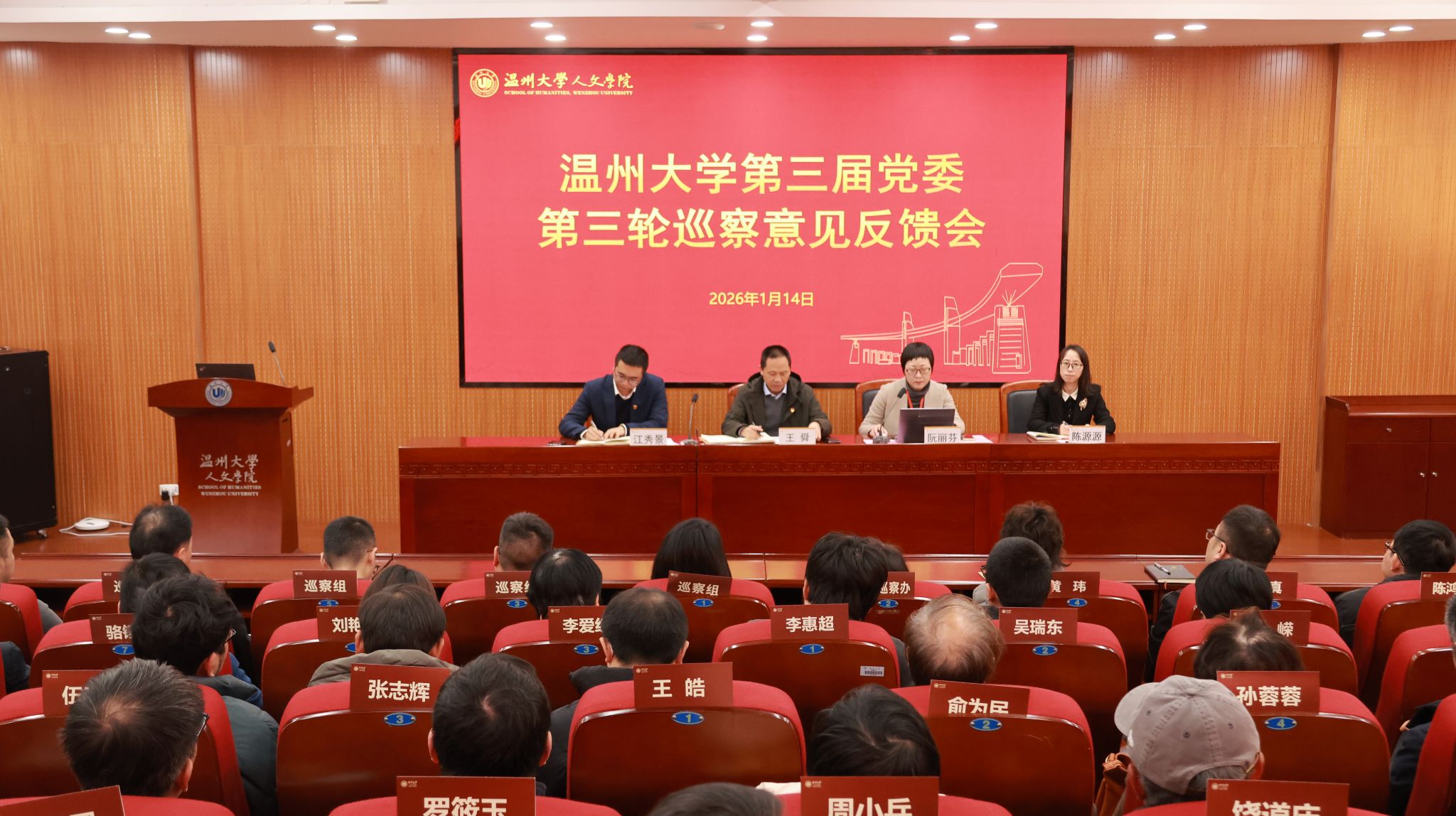 2026年1月14日下午13:00时,财神捕鱼 在203会议室召开财神捕鱼 第三届党委第三轮巡察意见反馈会,会议由财神捕鱼 党委书记江秀景主持。王舜副校长、党委巡察办、党委组织部、巡察组,财神捕鱼 领导班子、全体教师参加此次会议。