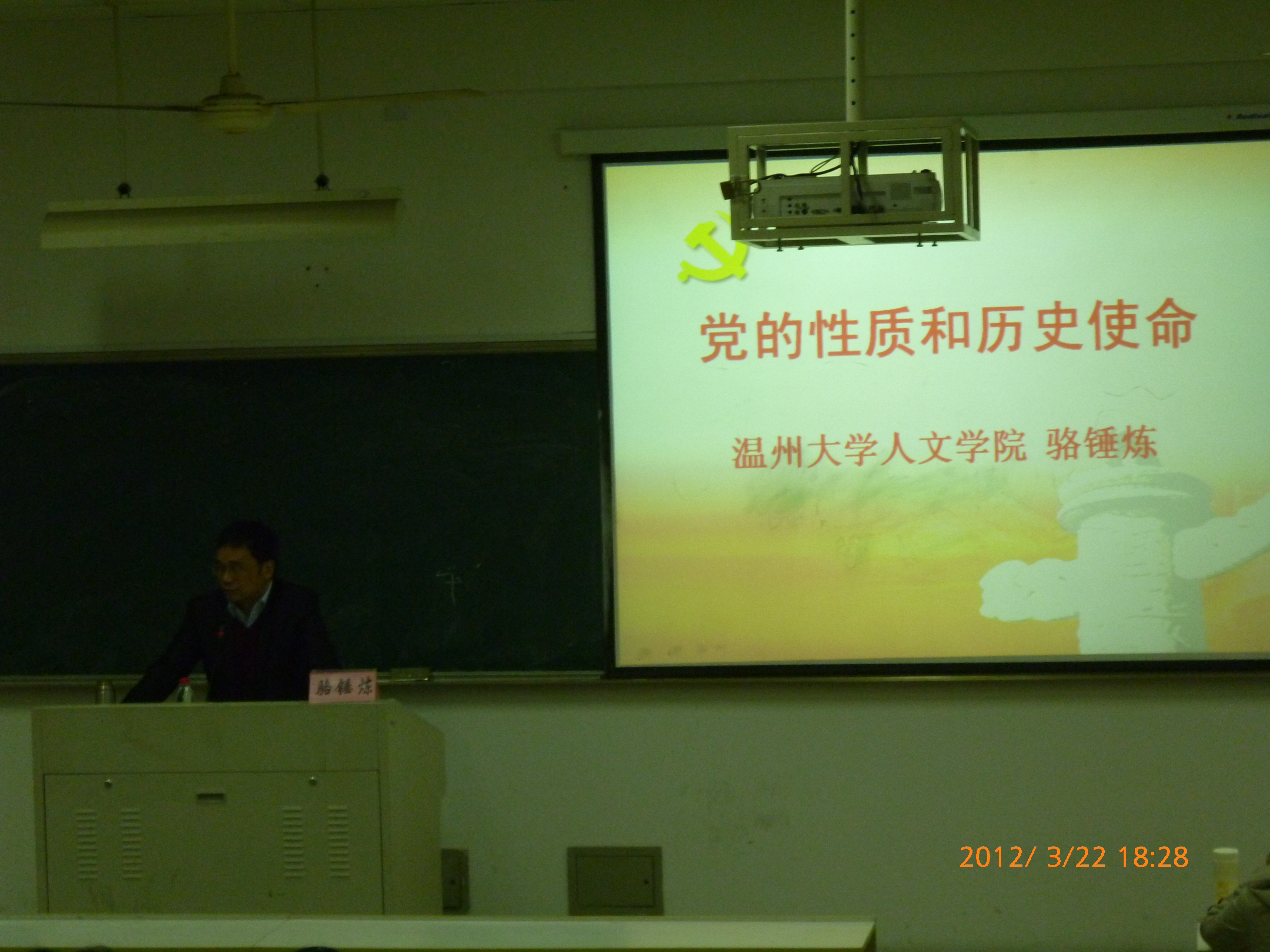 2012年3月22日晚18时30分,财神捕鱼 第十五期党校培训第二课在1-301开课。财神捕鱼 党总支副书记骆锤炼老师作为主讲人出席了本次党课。77名党校的学员和党员之家工作人员积极主动地前来聆听讲座。