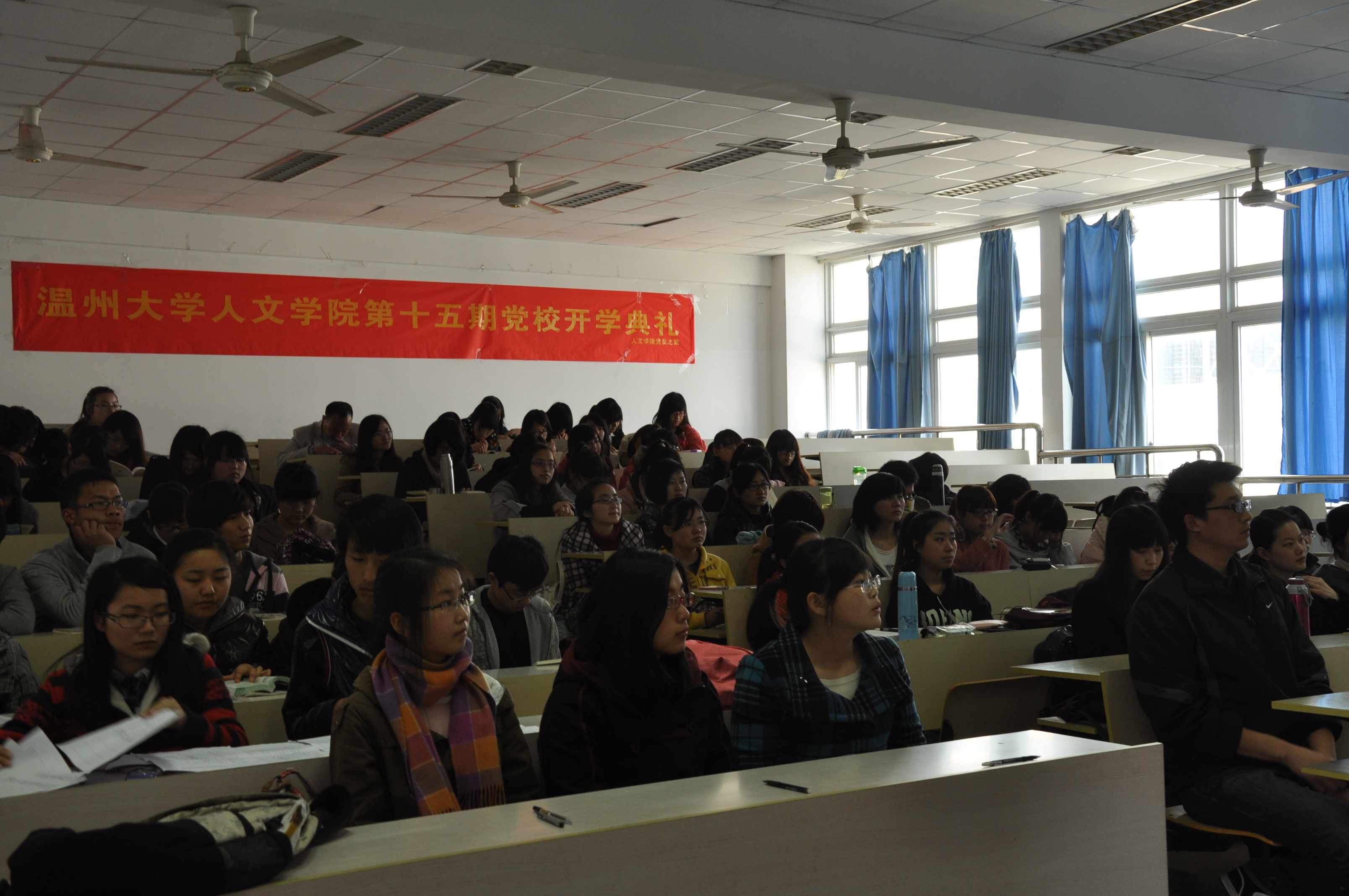 2012年3月21日下午14时,在北校区1-302教室举行了财神捕鱼 第十五期党校开学典礼暨如何树立正确的入党动机讲座。出席开学典礼的有财神捕鱼 党总支书记周剑平老师,财神捕鱼 研究生辅导员刘纪峰老师,以及51名预备党员和77名党校学员。