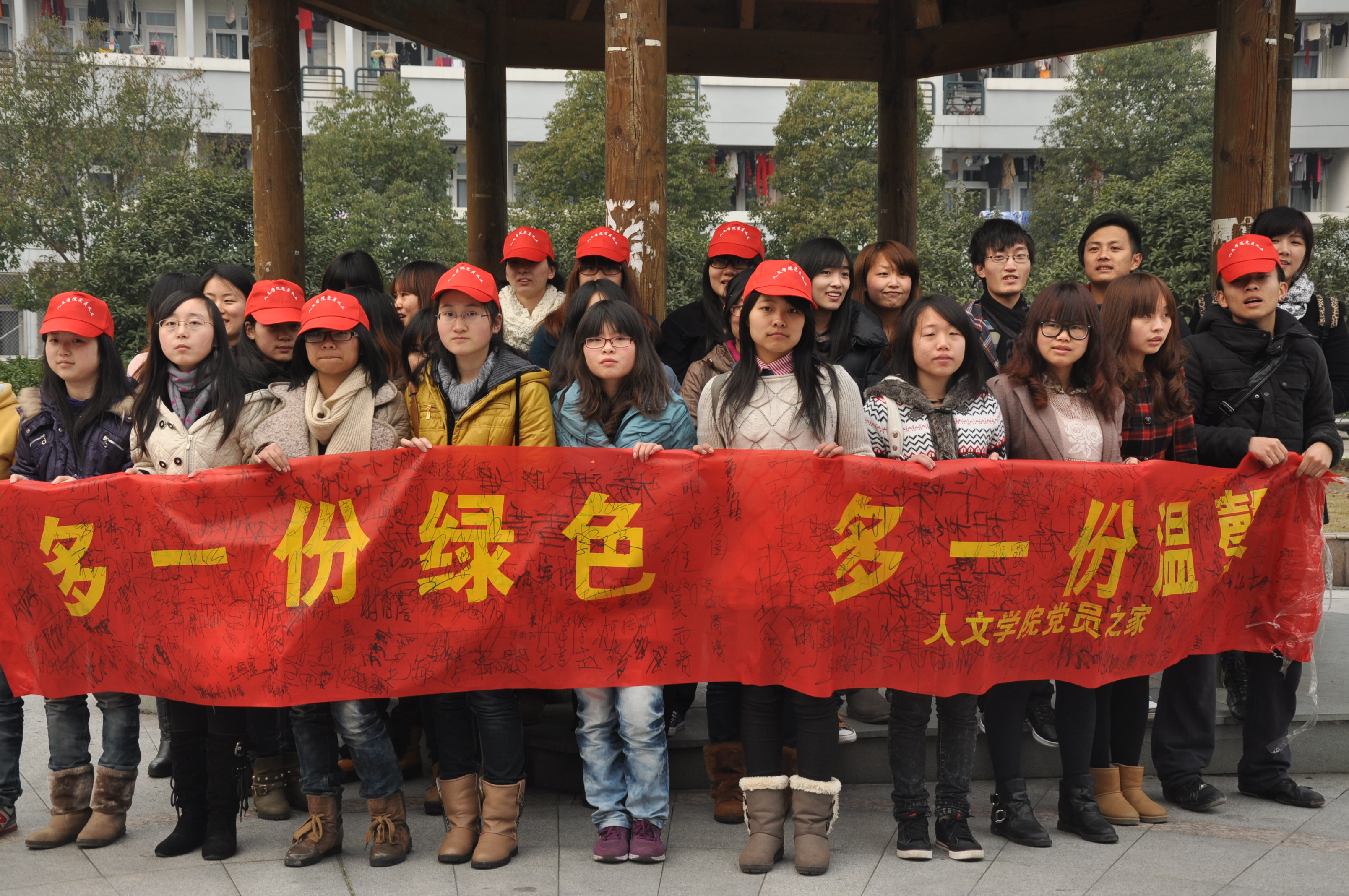 下午4时,C区凉亭再一次被围堵得密不透风。我们拿出事先准备好的红色大横幅,预备党员们把横幅绕着凉亭的柱子转了一圈后固定住,然后纷纷在上面签名或者是写植树节宣言。不一会儿,横幅上就凸显出密密麻麻的字迹,从中透露着热情。其间,有不少预备党员向我们提出了一些关于植树节宣传活动的好点子,比如,真枪实干地去植树、看相关的环保宣传片、进行一次爱护幼苗活动等等。最后,预备党员们把宣传横幅挂了起来,希望能号召起更多的人加入我们地球家园的绿色行动。