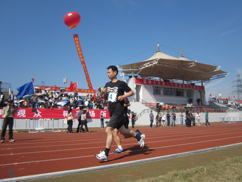 然而麻老师毫不气馁,咬紧牙关,调整呼吸,紧盯着前面一个目标,迈着均匀的步伐一步一步地追赶。不久,有几位老师已经面红耳赤,直喘粗气,而麻老师依然不动声色,甩动细瘦的胳膊和腿,脚踏在红色的跑道上坚定有力。