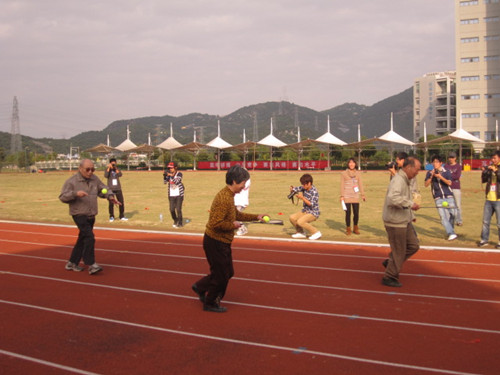 最令人感动的是退休组老师们的精彩角逐。虽然已是年过六旬的爷爷,奶奶了,却仍然精神矍铄,英姿飒爽。比赛一开始便引来了全场热烈的掌声,几位老人踏着稳健的步伐奋力地往前奔去,球在球拍上稳稳当当,青春的活力与光芒从他们的每一个皱纹里,从神采奕奕的眼神中折射出来。