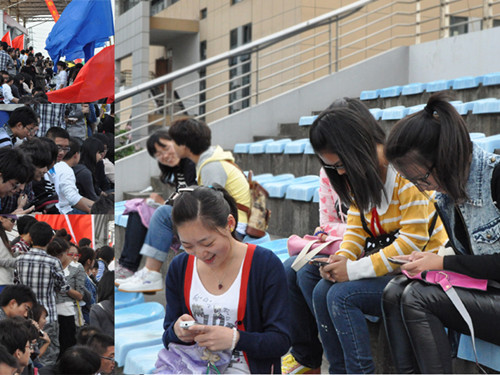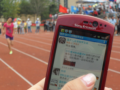 第三十四届校园运动会的时候,我们会发现许多拇指一族活跃在运动会的各个角落,他们用自己的手机拍下运动会的精彩瞬间并立即上传到微博上,及时有效地和大家分享火热赛事。