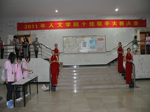 最激动人心的是第一个男生的出场。场光瞬间灭掉,只剩下两朵灯光投影的紫色花朵翩跹飞舞。来自11广本的13号选手丁宗和,一身黑衣,低首凝眸,忧郁的身影在台中显现。"当花瓣离开花朵,暗香,残留......"低沉的男声响起的时候,低回缱绻,所有人的内心都被深深地打动了。唱到动情的时候,歌声像大海,温柔深沉,宽广,海底波涛涌动,有着一种不可抵挡的力量,直达人的心底。间奏起,11广本的亲友团排成队送上了鲜花和拥抱。