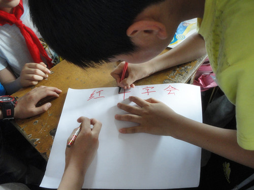 老师和负责人的协助下,志愿者们确定了五(3)班为活动对象。这次活动的主要内容是,小朋友们根据"红十字"的主题,共同合作制作海和手抄报。活动开始后,志愿者们首先对班级51位同学进行了分组,然后分发画纸。各个志愿者辅导6~7位小朋友。由于考虑到小学生对红十字会没有太多了解,志愿者负责人事先搜集了相关资料,分发给小朋友们参考。在活动过程中,所有小朋友都积极参与,拿出画笔,共同商讨绘画。志愿者们也为其提供不少帮助。在将近一个小时的活动中,志愿者们和小朋友们建立了良好的关系,绘出了能表达自己心声的图画。