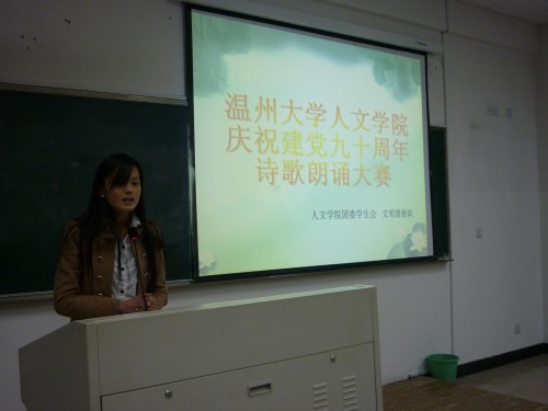 这次朗诵比赛在建党九十周年之际,展示了我们当代大学生的爱党爱国情感和勇担责任继续发扬党的优良传统的信心和热情,不仅锻炼了大家的信心提高了朗诵水平,更激发了大家爱党爱国的情怀。