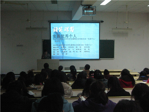 实践中心负责人张建增为大一同学做了2011年暑期社会实践活动方案指导,意在让大家对社会实践活动有更加明确的了解。随后,麻老师对暑期实践活动做了进一步的总结。麻老师指出“受教育,长才干,做贡献”是我们举行这个活动的主要目的。他还通过大学生为留守儿童和农民工子弟补课等例子生动地为大家讲解了实践活动对学生和社会的意义。最后,荣获“优秀团队”称号实践队的队长罗倩倩和沈芳展示了各自团队在暑期实践活动中的风采。