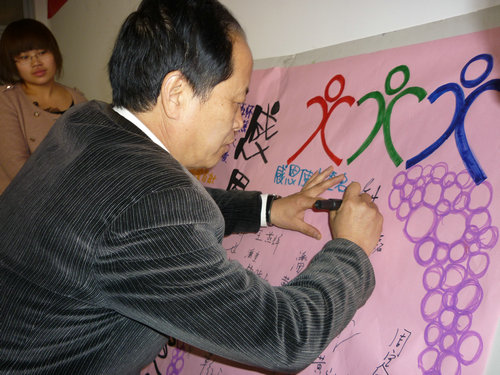 向意达来访人员表示了热烈的欢迎和感谢并简述了受助学生的基本情况。紧接着,王校长发表讲话,教导在场学生要不怕困难、好好学习、好好生活、学会感恩、回报社会。之后,受助学生们分别讲述了自己在上学期的学习和生活情况,谈了自己在春节的经历并诉说了自己对未来的期望。“小事情里见真情”,这是王校长总结学生发言后的感受。他不仅告诫学生们勤工俭学不能影响学业、学生要以学习为首要目的,而且期望学生们要有更高的道德素养,尊敬师长、帮助他人、做个全面发展的人。随后,在曾老师的主持下,受助学生作为首批感恩使者宣读了感恩宣言,学生代表还向王校长献上鲜花表示敬意。在骆老师和王校长的带领下,全体参加人员都在宣言板上签名,留下了美好回忆。最后,王校长代表意达集团授予学生奖学金。