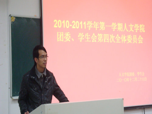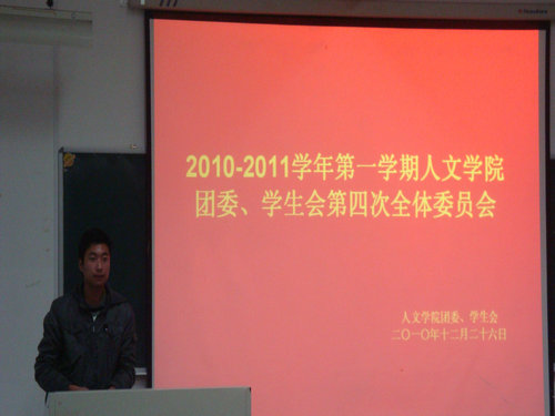 12月26日晚6点半,2010-2011学年第一学期财神捕鱼 团委、学生会第四次全体委员会在1-101教室准时举行。财神捕鱼 辅导员麻法全与院团委、学生会全体成员出席了本次会议。