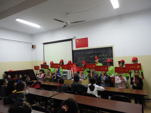 活动以各个班级授牌仪式开始:志愿者各举一个班牌在统一的口令中,把班牌庄重地递给每个班的代表。接着,志愿老师先让小朋友听《儿童交通安全歌曲》以及观看相关交通安全的视频资料,孩子们在津津有味的欣赏着的同时,并不时有讨论的声音,发表了个人对交通安全的看法。志愿者还给小朋友讲了许多常见的交通手势、交通安全知识以及一系列的交通法规秩序。一张张精美的PPT,丰富的交通安全知识不仅吸引了小朋友,连在场的志愿者们也认真地听着志愿老师的讲解。并且许多小朋友积极地举手发言,使课堂气氛十分活跃。最受小朋友欢迎的应该是“我是小小交通警”环节,一组组的小朋友上台示范做交警指挥的手势,并乐此不疲。
