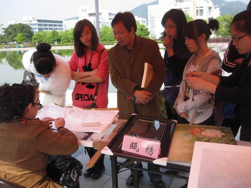 温州具有悠久的历史,从东晋明帝太宁元年建城开始至今已有1700多年的历史了。温州向来有“七山二水一分田”之说,这样的地理环境也为温州赢来了“百工之乡”的美称。近年来温州很多工艺都成了“全国非物质文化遗产”。本次活动由于很多美术家的参与,吸引了很多大学生的兴趣。本次活动在财神捕鱼 北校区人工湖畔展开,现场热烈非凡,同学积极参与。大家怀着极大地好奇心在各个展柜前参观、学习并亲自实践。现场有道情表演、提线木偶和舞龙表演等,引来大家阵阵掌声。活动现场还有现场教你学剪纸的活动项目,许多同学都跃跃欲试,两百份红宣纸在同学手中很快都成了艺术品。
