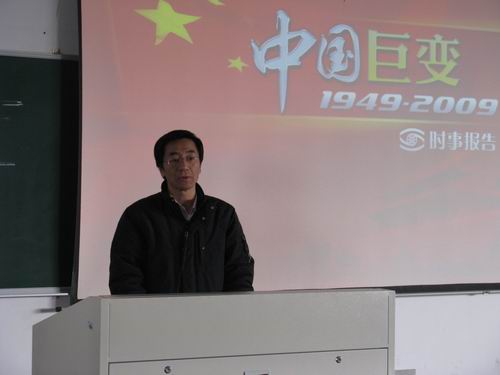 15:15,魏书记准时开始上课,教室里已经座无虚席。魏书记今天主要讲的是新中国成立60年以来神州大地上所发生的翻天覆地的变化,并就60年来中国十大成就展开了详细的讲述,介绍了中国经济腾飞、农业发展、民生改善等巨大成就。魏书记旁征博引,深入浅出,生动地在我们面前展开了一幅中国腾飞的历史画卷。同学们认真听记,获益匪浅。之后,同学们又观看了有关近代中国历史发展进程的专题片,在魏书记的带领下一起回顾了中国在历史潮流中沉浮斗争、不断探索开创的历程。4点45分,整堂课顺利结束。