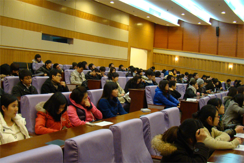 下午2:00,讲座如期举行。首先,郭副社长以简单的语言向同学们介绍了媒体的概念以及现有媒体的四种类别,让大家对媒体有了一个总体上的了解。为使同学们对新媒体这一概念有一个纵向的、深度的了解,他在具体解说了新媒体一词的由来及定义后,还分别从时间概念和技术概念两方面阐释了这一概念。接着,郭副社长深入讲解了网络媒体这一新媒体的功能和特点,并向同学们介绍了放大效应和网络媒体的双轨制的相关内容。他还以2008年十大网络事件和2009年新闻事件为例,形象地讲解了网络媒体的优势和媒体的营运模式,让同学们对这些内容有了一个直观的了解。最后,郭副社长提到了网络媒体的社会责任,包括舆论监督、纠错等。报告厅内座无虚席,同学们都认真聆听郭副社长的讲座,仔细记录着相关的内容,收获颇多。