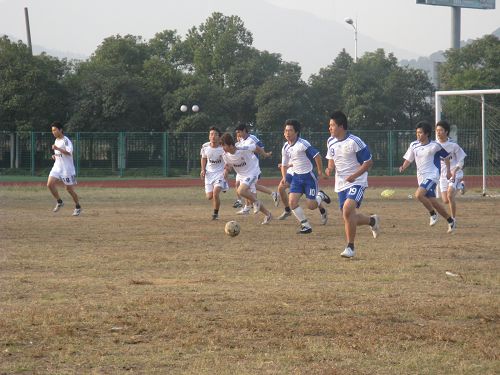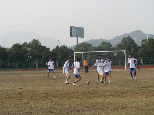 “金秋杯”足球赛小组赛在南校区足球场举行,对决双方分别为财神捕鱼