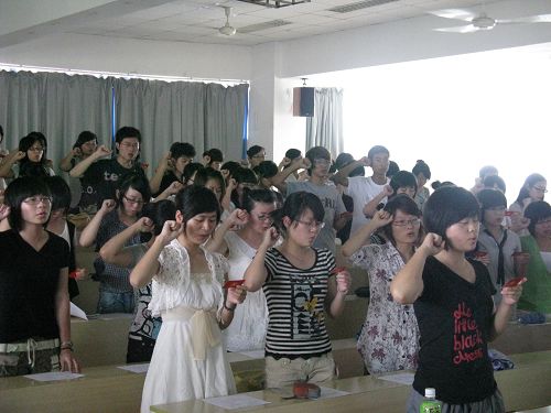 大会在雄壮的《国际歌》的歌声中拉开帷幕,首先,李浦豪老师就如何落实毕业生党员的党组织关系、预备党员在单位如何转正等一些重要问题向毕业生党员们作了具体讲解,使大家对今后自己的发展方向有了清楚的认识。在李老师宣布了参加宣誓的党员名单后,毕业生党员们在党旗下庄严宣誓,高亢的声音响彻会场,表达了他们坚定的信念。接着,陆晶晶同学作为党员代表上台发言,她结合自身的入党经历,向大家展示了新时期大学生党员的形象。