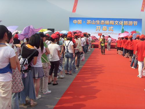志愿者准时到达南校东大门进行集合整队,校中心同学向大家简要介绍了活动的流程,并提醒了同学们需要注意的事项。接着,大家准时到达了开幕式的现场。9点,开幕式正式开始,一时礼炮齐鸣,欢乐奏响,现场气氛开始活跃起来。共有包括巾帼志愿者代表队、茶山总工会代表队等五支代表队来到了开幕式现场。歌曲《今天是个好日子》唱出了茶山人民激动喜悦的心情,激情的爵士舞将活动气氛带到了高潮,《高山流水》、《梁祝》的古筝表演更是将人引入茶山美景的亦真亦幻中......瓯海区区委领导还为大家讲述了茶山杨梅的悠久历史及其发展过程与现状,现场人山人海,气氛异常活跃。最后,温州市市委常委兼副市长宣布中国•茶山生态杨梅旅游文化节正式开幕。