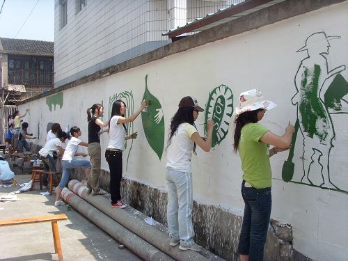 上午,队员们来到丽岙,首先进行分组,将手绘墙的任务进行了分配。然后队员们一起上阵,在墙上画出图案的轮廓,最后调色、上色。在此过程中,不少人将颜料滴到了身上也毫不在意,继续认真地画着。虽然气温很高,阳光也十分地猛烈,但大家没有丝毫的抱怨,继续认真地在墙上作业。很快,原本全是广告的墙壁已被一幅幅形象美丽的环保图画所替代。壁画得到了当地的政府领导和居民的一致好评。